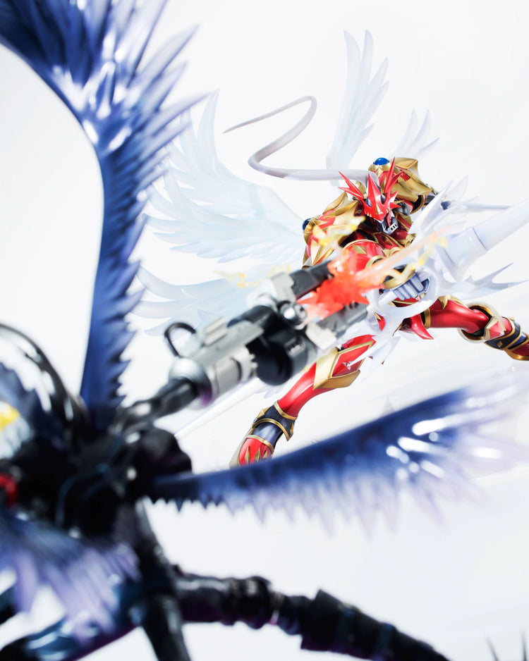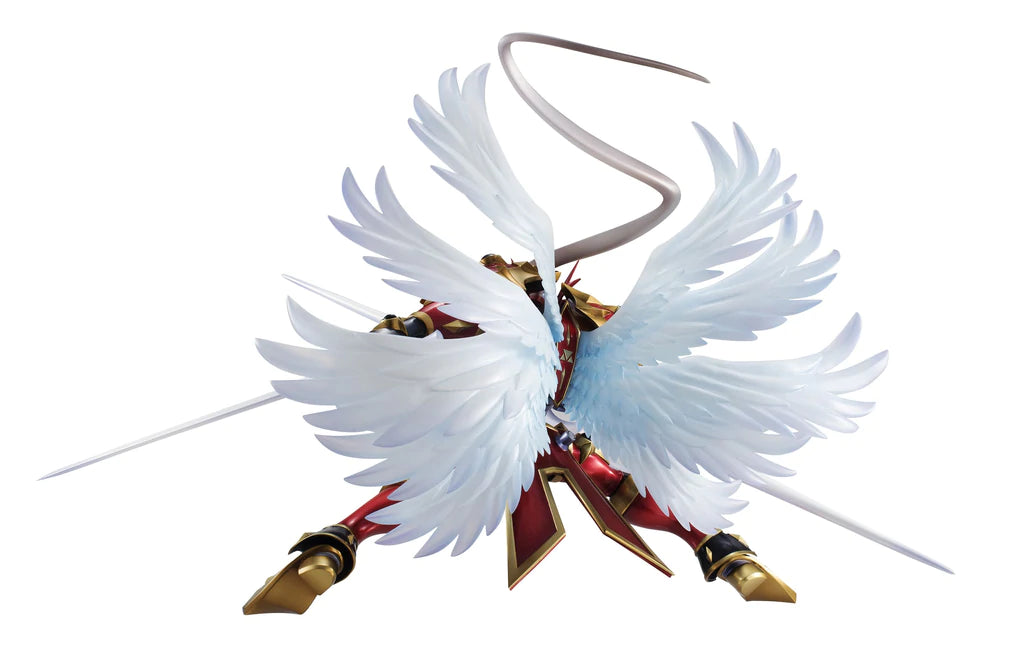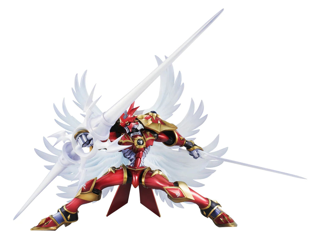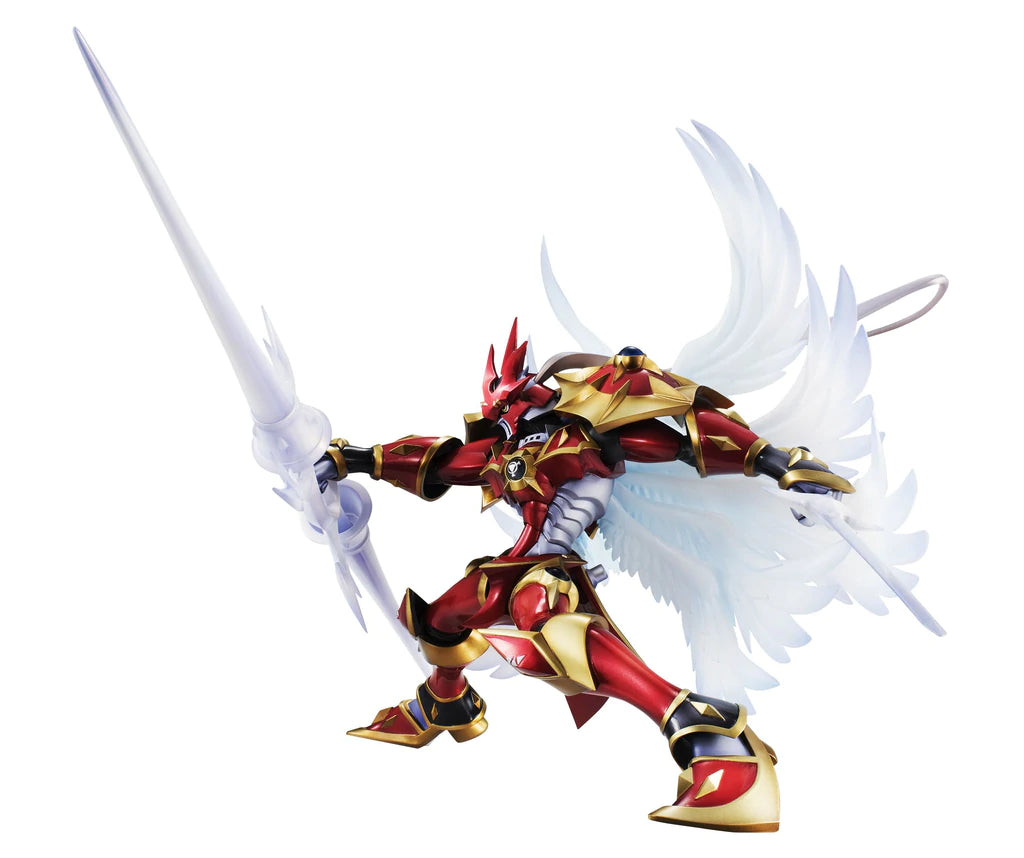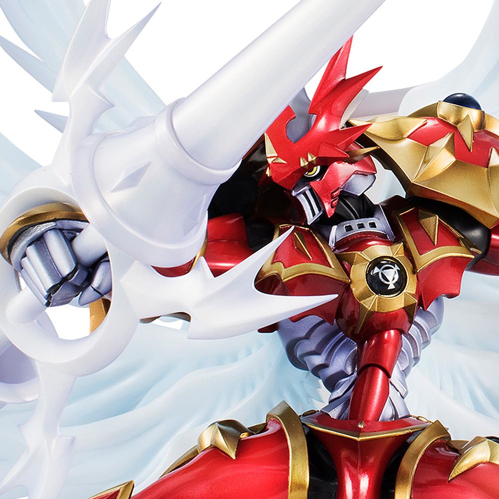 Gallantmon has been sculpted in his brilliant crimson armor overflowing with power, and in his hands he holds the divine lance of light, "Gungnir", and a divine sword of light, "Blutgang" making for a heroic appearance that has been sculpted and painted in intricate detail for fans to enjoy.