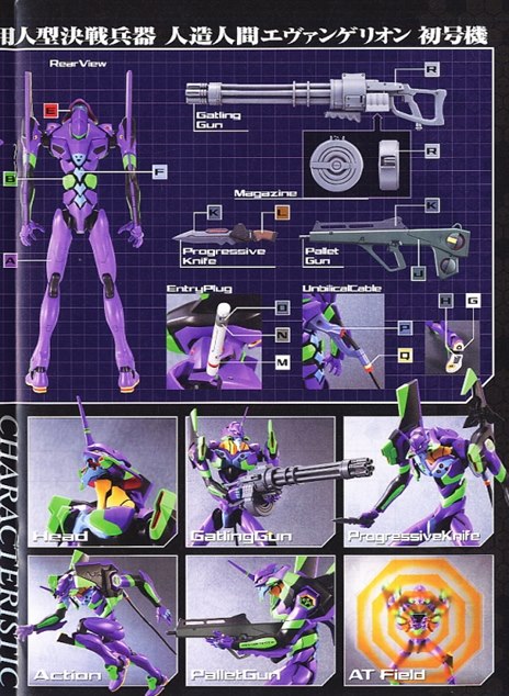 This highly detailed kit of EVA-01 as it appears in the "Rebuild of Evangelion" movie series features nicely articulated joints (including seamless arm joints) and comes armed with a progressive knife that can be stored in its left shoulder armor, gatling gun, and a pallet rifle. Other accessories include an entry plug that can be inserted behind EVA-01's neck, six optional hands, and an AT field with an opening in the middle that can be used to recreate the memorable scene where EVA-01 tore open Sachiel's AT field! Dry transfer decals and foil stickers are included to detail the kit even further after completion. A special joint part is included to display your completed EVA-01 kit on Bandai's Action Base 1 (linked below).