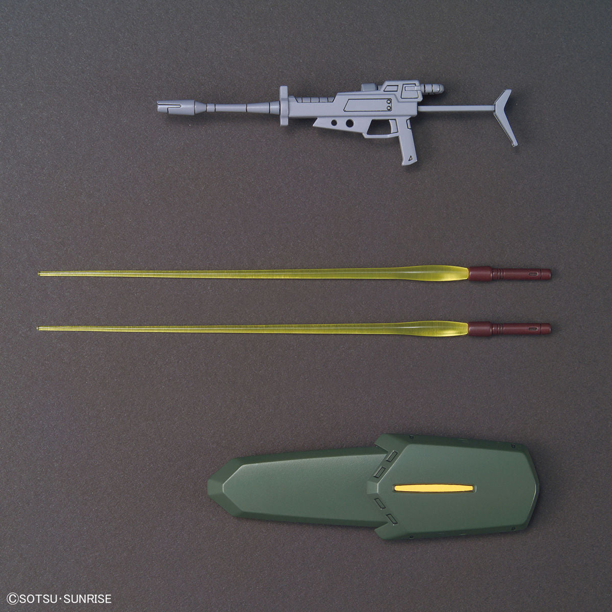 This kit includes a newly-molded version of the Gelgoog rifle, and features a sliding gimmick for the shield.
