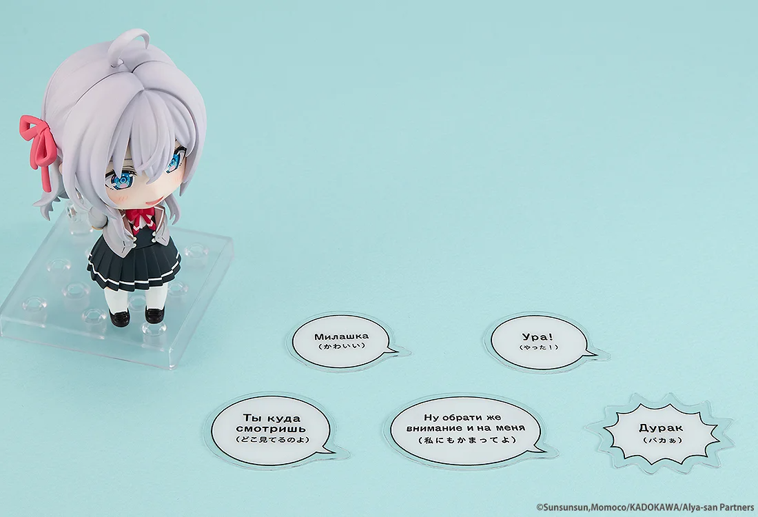Alisa Mikhailovna Kujo from the anime "Alya Sometimes Hides Her Feelings in Russian" is now a "Nendoroid" figure from Kadokawa! She comes with three interchangeable faces: an open-mouthed smile, a glaring expression, and a smile with a closed mouth. She also has five different speech bubbles in Russian, along with a support arm and attachment part, plus a base for display.