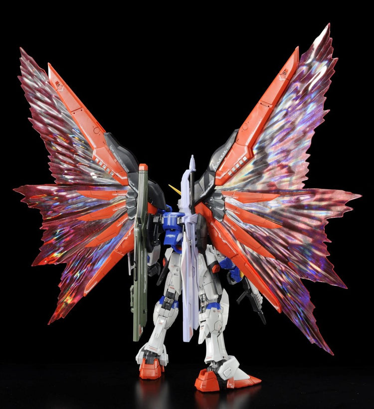 Each wing effect part is crafted from clear, color-layered material with a radiant gradation finish that captures the shimmering aura of Destiny’s full-power mode. These parts attach seamlessly to the existing RG Destiny Gundam kit, enhancing both dynamic display and screen-accurate posing.