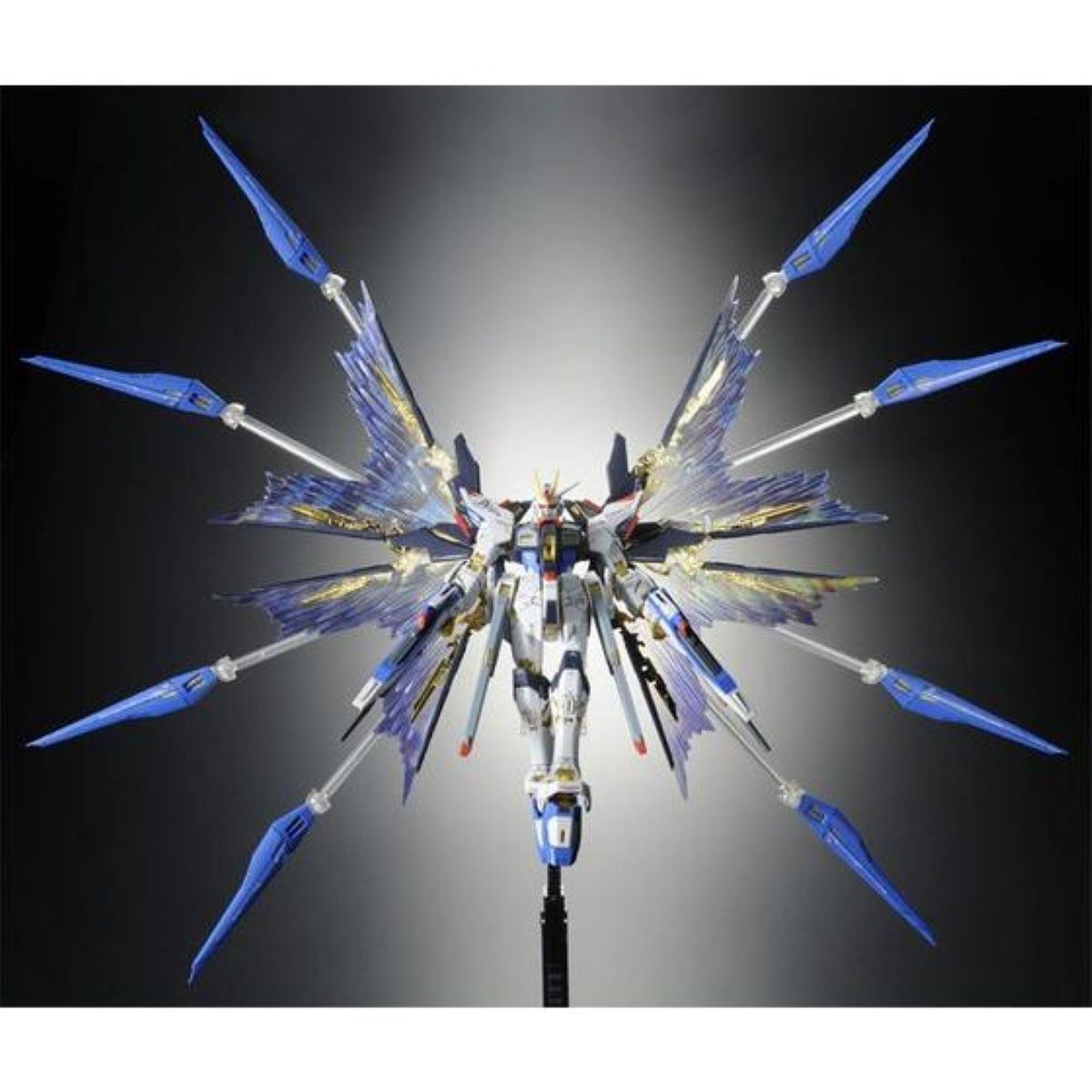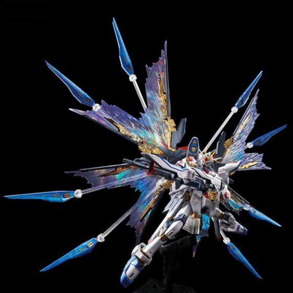The set includes a pair of large, translucent effect wings with shimmering gradation that recreates the energy plume visuals during Strike Freedom’s high-mobility flight mode. Special joint parts allow for easy attachment and secure display, making this an essential enhancement for fans seeking maximum visual impact from their RG Strike Freedom build.