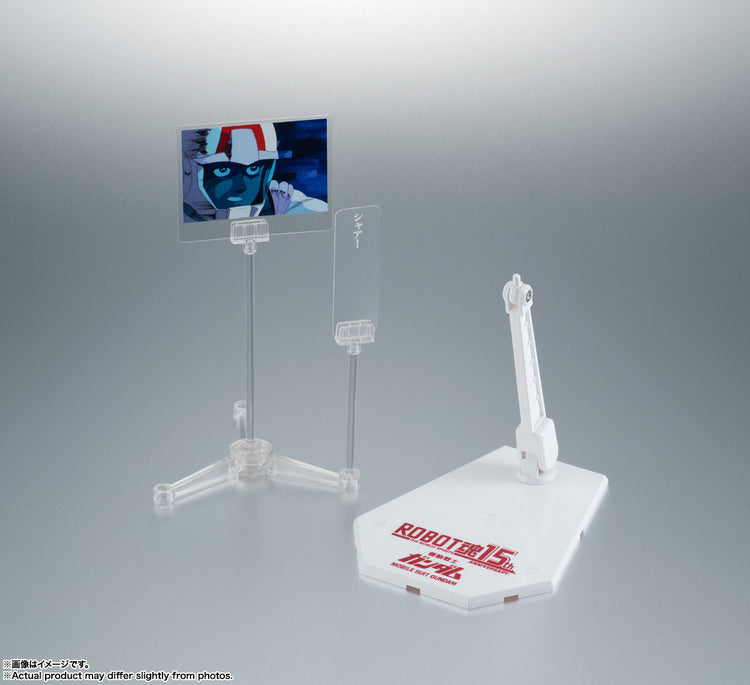 Here comes a special "Robot Damashii" set to commemorate the 15th anniversary of Bandai's fan-favorite action-figure lineup! The original Robot Damashii RX-78-2 Gundam Ver. A.N.I.M.E. from "Mobile Suit Gundam" is back with an original base molded in white, with the special "Robot Damashii 15th Anniversary" logo printed on it; Amuro Ray is the focal point of the special display sheet, along with a dialogue plate! The Gundam Hammer and Beam Javelin are also included, with a slightly different shape and molding color.