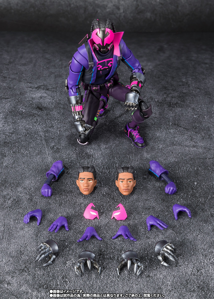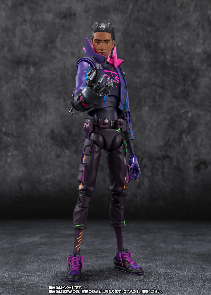"Miles G. Morales from "Spider-Man: Across the Spider-Verse" is now available as an action figure in S.H.Figuarts! This figure is sculpted and painted in the same style as the original "Across the Spider-Verse", using the same techniques developed by the "Across the Spider-Verse" team, including neon coloring and the characteristic gauntlets on his arms. Two replacement face parts are included, allowing you to enjoy the figure both with and without the mask!"
