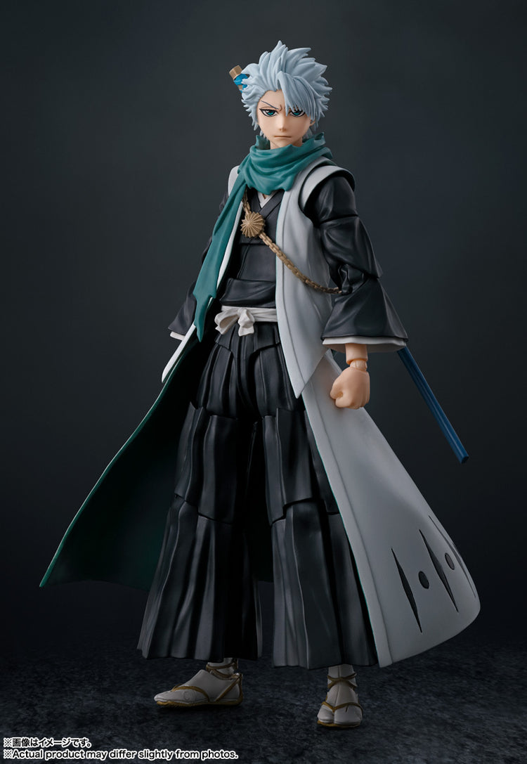 Toshiro Hitsugaya, the 10th division commander of the Gotei 13 Corps in "Bleach," joins the "S.H.Figuarts" action-figure lineup from Bandai! He's sized to accurately represent his height compared to that of other "Bleach" characters in the series, and his haori is movable so its fluttering motion during battle can be recreated for dynamic poses! The figure has ample range of motion for maximum action. The Zanpakuto sword can be displayed sheathed or unsheathed, and he comes with four interchangeable faces and multiple interchangeable hands, too.