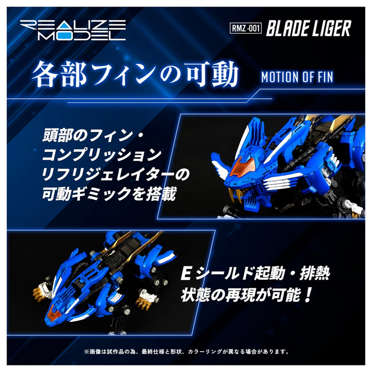Takara Tomy's "Realize" model-kit series brings you enhanced mobility, ease of assembly, and collectability. The number of parts, size, design, and structure are all pursued from the user's perspective. This new "Realize" 1/100-scale model kit of the Blade Liger from "Zoids" has a specially designed movable mechanism for posability, making it easy to put the finished model into lots of characteristic poses, like roaring and running. The weapons installed all over the body are movable too, making it possible to recreate your favorite battle scenes. Effect parts to recreate the laser blade in its activated state are included; they're molded in clear resin to reproduce its glowing state. Three types of pilot figures are included too (a regular soldier, Van, and Fine). No batteries are required!